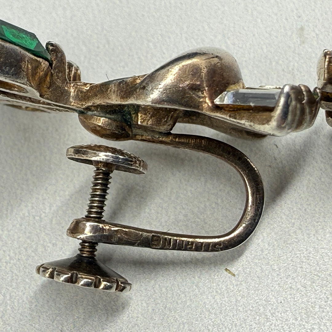 • Type: Vintage 1940s sterling earrings, vintage Retro sterling earrings, Vintage faux emerald rhinestone earrings, 1940s screw back earrings, sterling earrings, Vintage jewelry, Vintage jewellery, vintage costume jewelry.