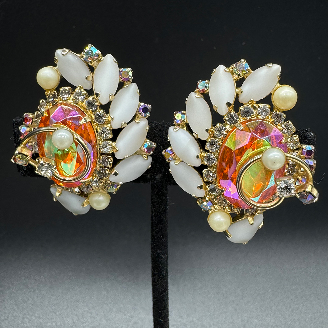 These beautiful earrings feature a double level of design. The earrings feature a large oval tangerine-colored faceted rhinestone flanked by frosted milk-glass navettes and aurora borealis rhinestones. Atop of the oval faceted center stone is a curved wire surmounted by a faux pearl and rhinestone. The multiple layers and play of both color and rhinestone shapes is fabulous.