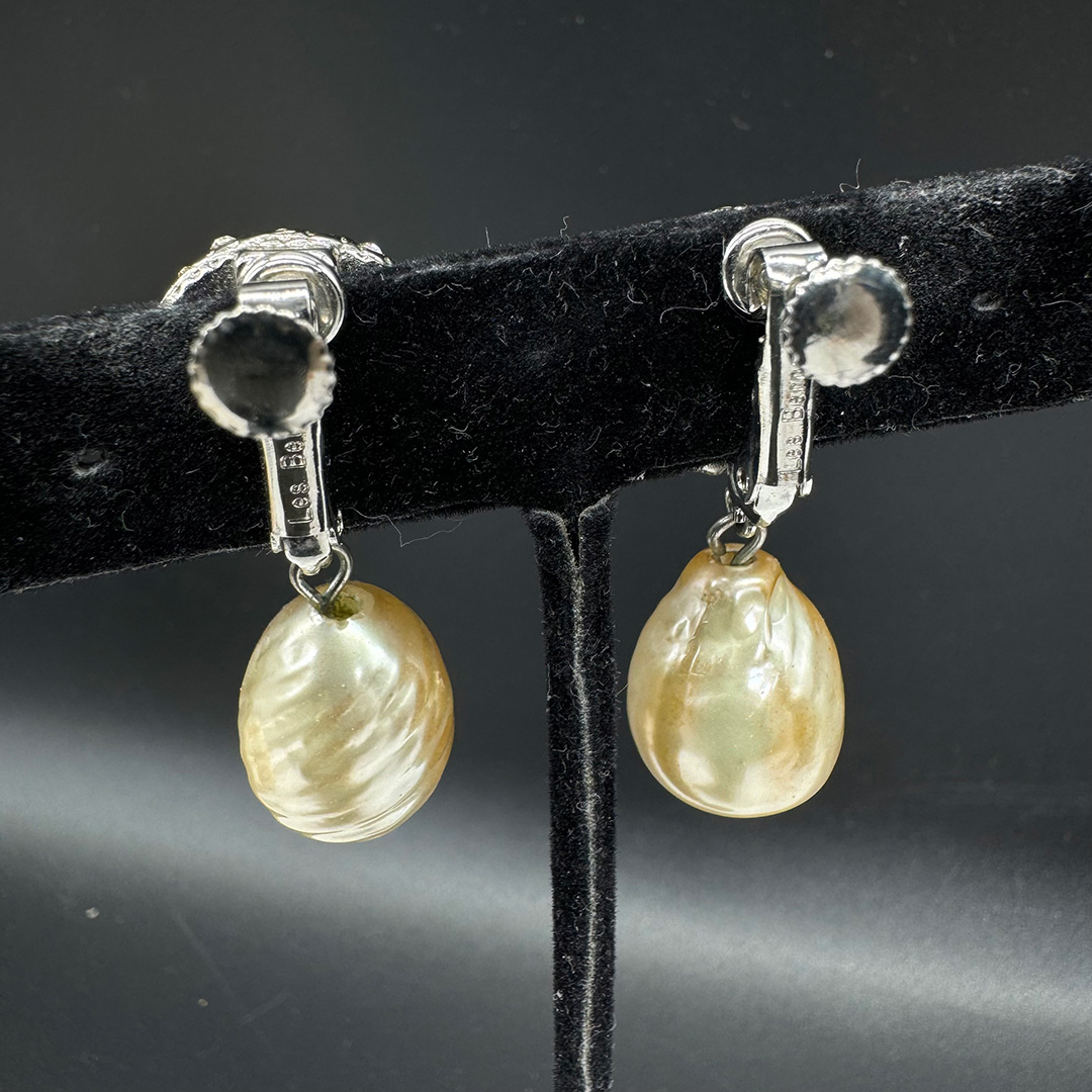 These Les Bernard faux pearl earrings feature an encrusted pave-set rhinestone surmount suspending a glass pear-shaped faux pearl. The pearl is typical of what we often seen on French jewelry. Both faux pearls are slightly irregular and are not an exact match, but rather, add to the intrigue of the earrings. They can be comfortably worn by adjusting the tightness of the earring with the screw-back mechanism.