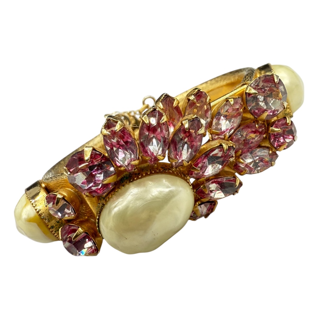 Gorgeous pink givre rhinestone and large faux pearl bracelet and earring set. Hinged on sides for easy fit with beautifully texted metal work. Generous oval faux pearls measure 13/16″ x 1/2″ and are accented with a “fan” of double-layered marquis-cut pink rhinestones giving the earrings a three-dimensional appearance. Safety clasp and chain for added security.