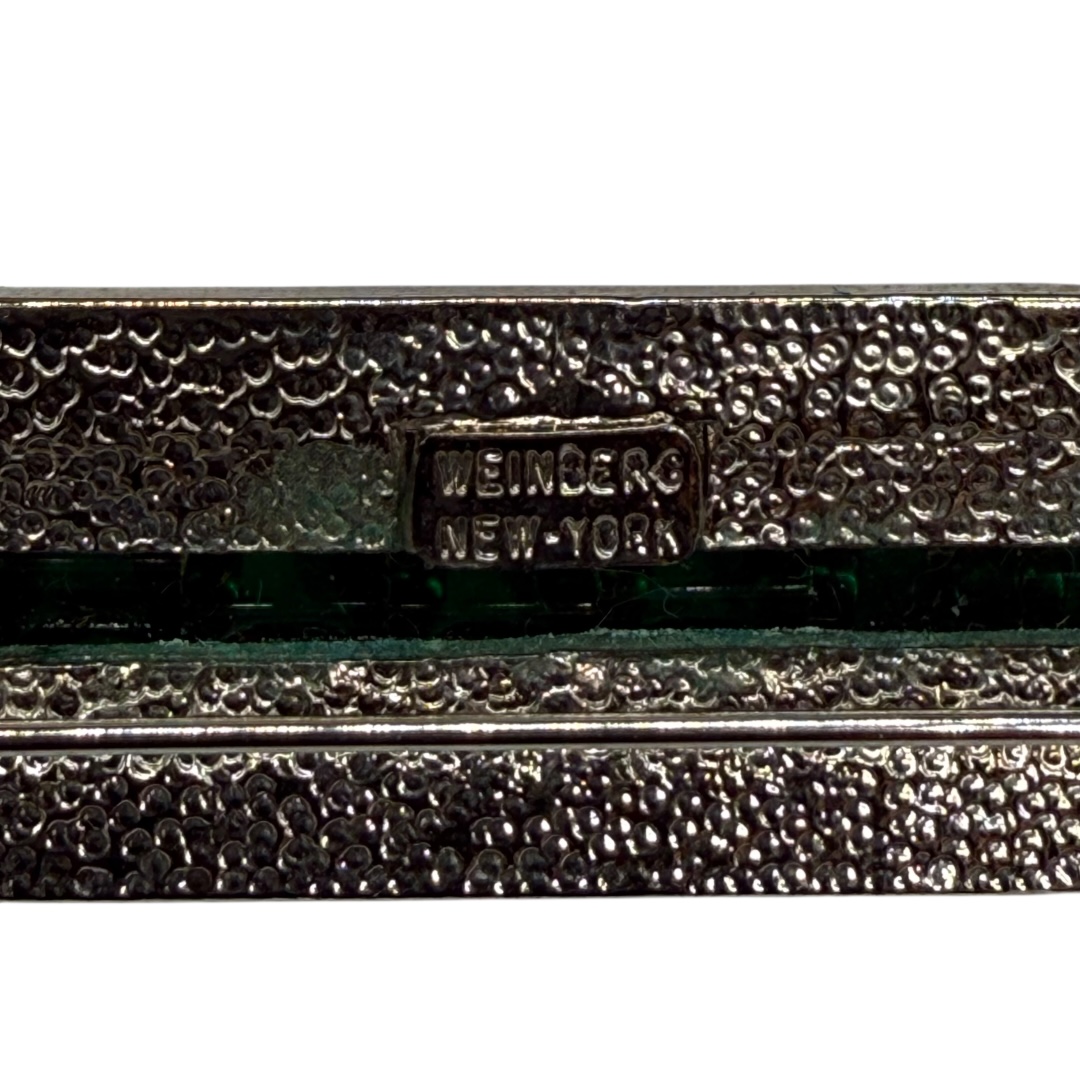 Keywords: Weinberg brooch, 1980s vintage brooch, Art Deco revival jewelry, emerald glass pin, collectible Weinberg New York