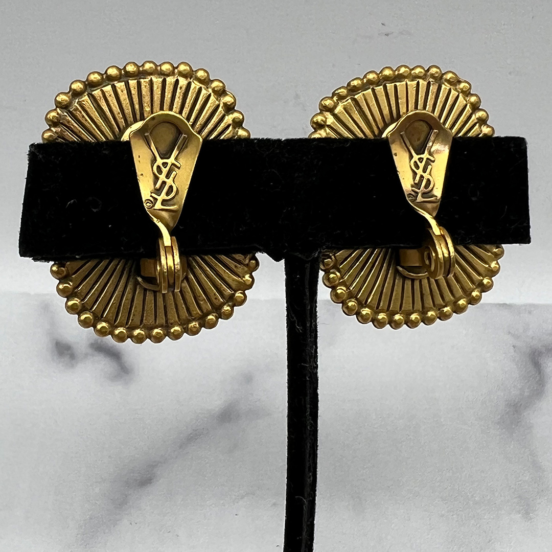 • Type: Y.S.L. jewelry, 1980s earrings, Large cabochon earrings, Amethyst-colored earrings.