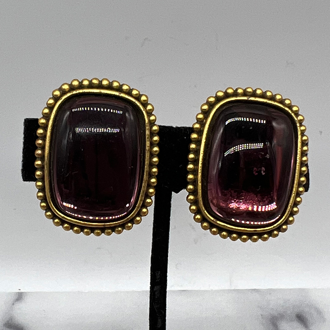 These are lovely Y.S. L. large rectangular-shaped amethyst-colored cabochons earrings flanked by a “beaded” exterior trim. Plated in an antiqued-gold tone. One of the best prices on the internet!