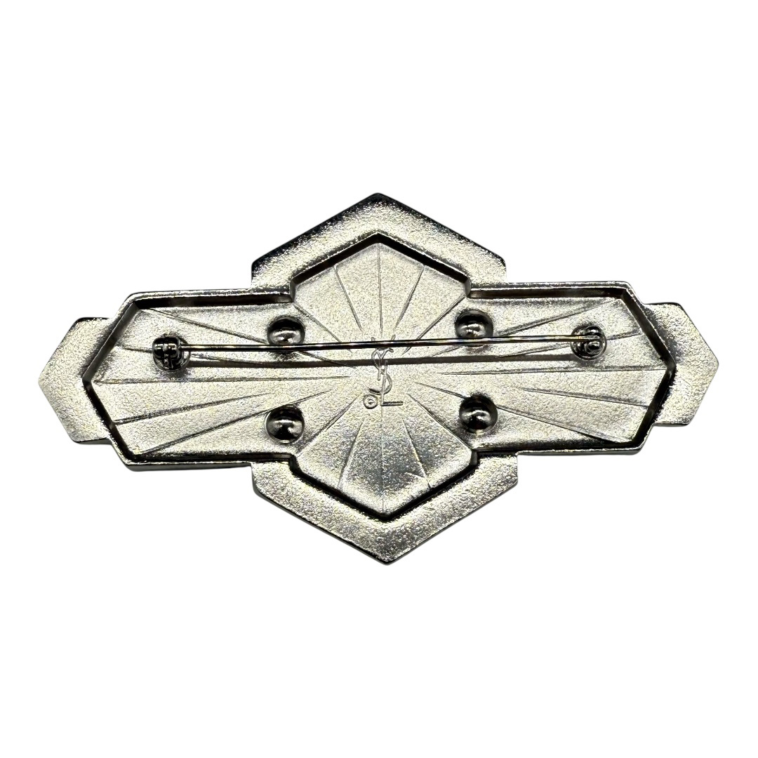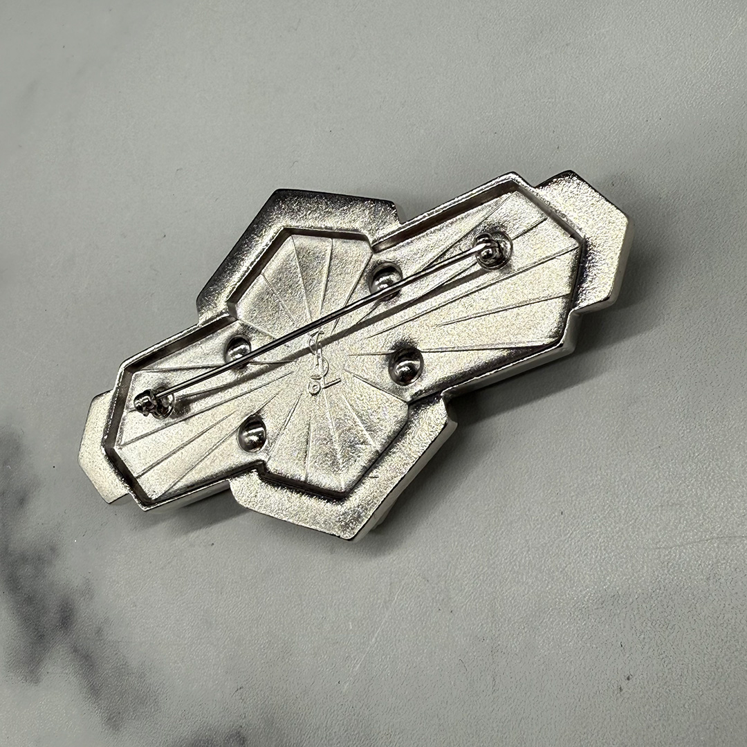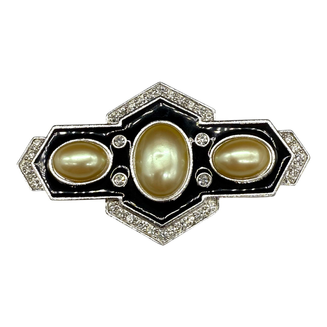 Fabulous c. 1980s YSL deco style brooch/pin. Large oval pearl cabochons in a heavy cast brooch. Wonderful black enameling has this piece really pop! Center faux pearl cabochon is flanked by four chaton crystals. The brooch is marked YSL.This fantastic pin would be the perfect accent for a clutch purse or hat. Transforming your simple French moiré satin clutch bag into a “WOW” arm ornament. A must have for the lover of vintage Y.S.L. jewelry and accessories. Yves Saint Laurent has been heralded as one of the greatest couture houses of last half century. Always on the cutting edge of innovation and design vintage pieces of Y.S.L. jewellery are as vogue today as the day they were introduced into the collection. This is a must have for the collector of YSL vintage jewelry. A classic addition of avant- garde bijoux. ADULT SIGNATURE REQUIRED FOR USPS DELIVERY.